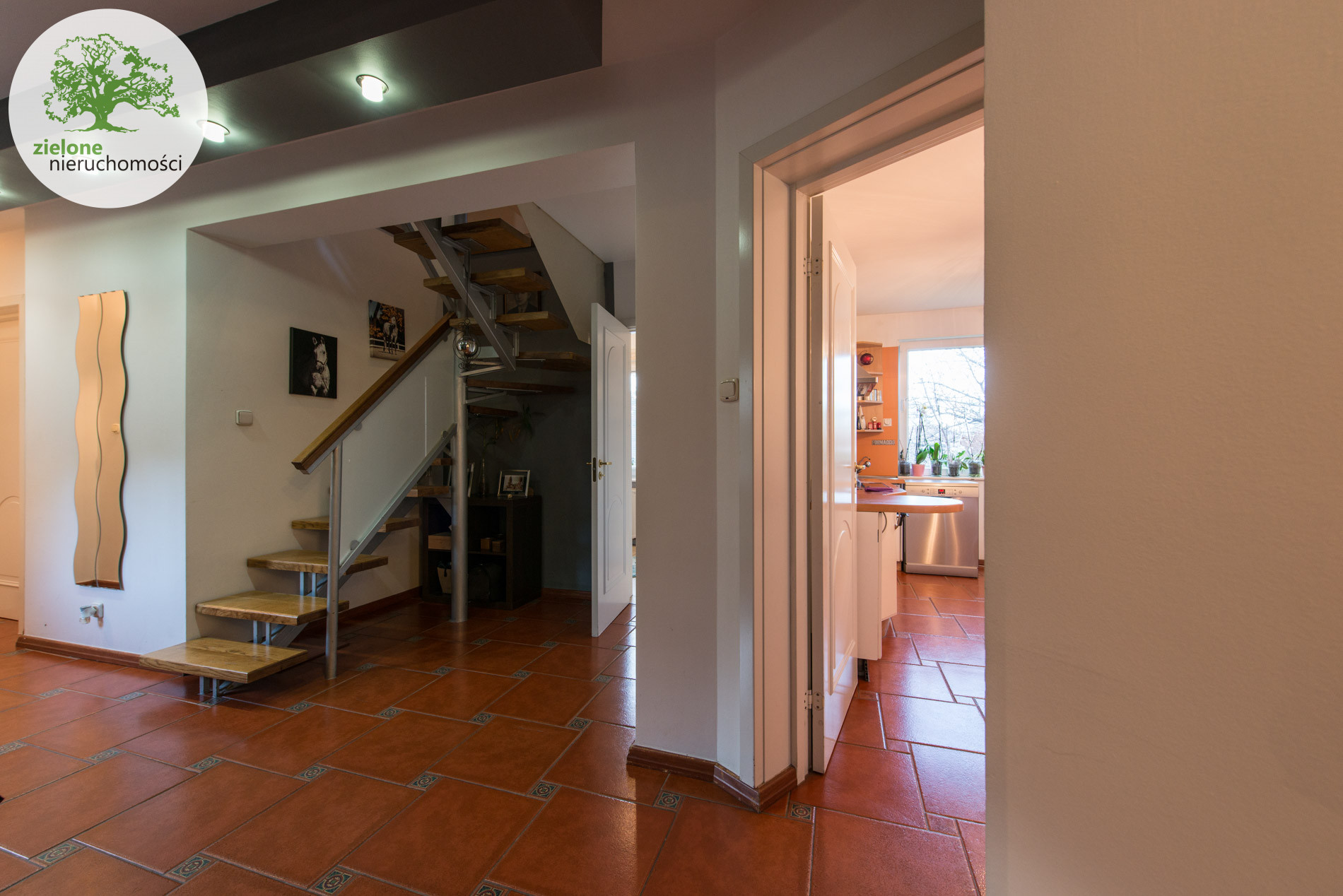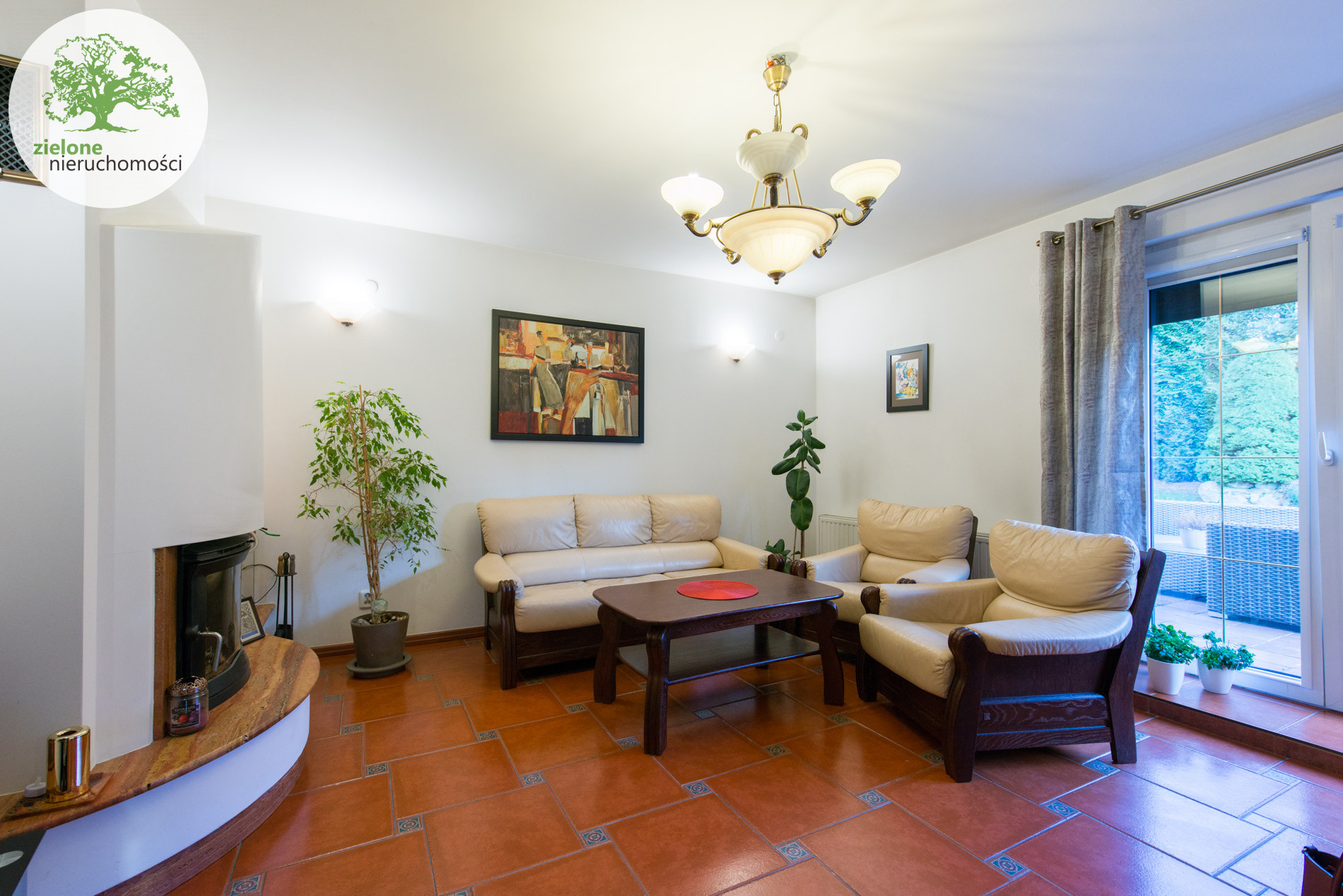 parter: salon z kominkiem i wejściem na taras, 2 pokoje dzienne, kuchnia ze spiżarką, łazienka,