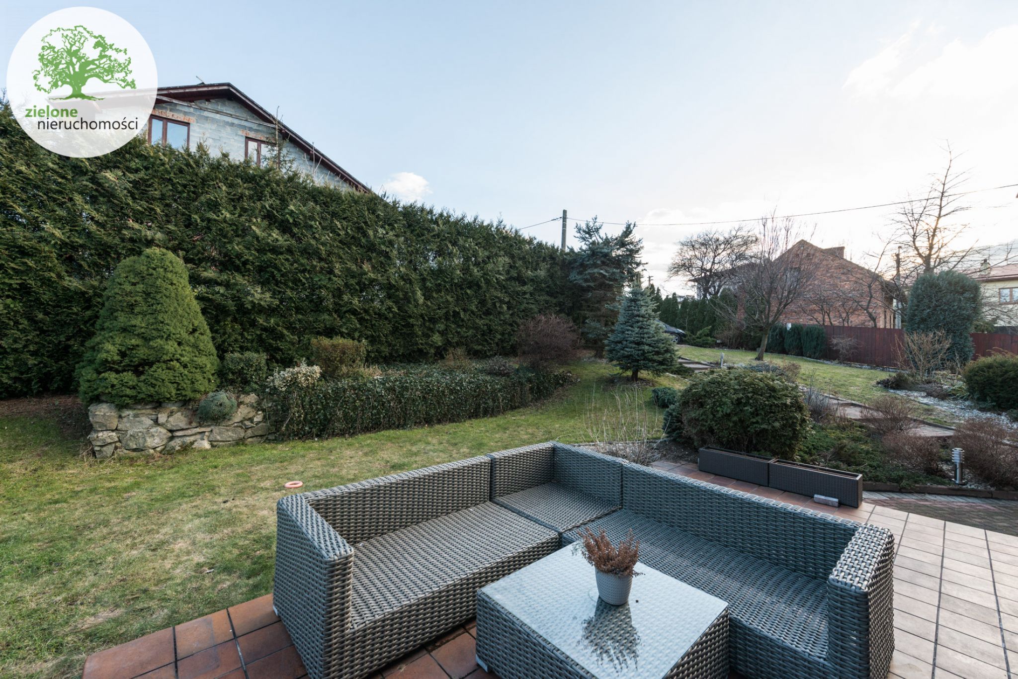 Ogród jest zagospodarowany z licznymi nasadzeniami. Brama wjazdowa na pilota, podjazd w dużej części wybrukowany. Dom nie posiada garażu, ma dwa naziemne miejsca parkingowe.
