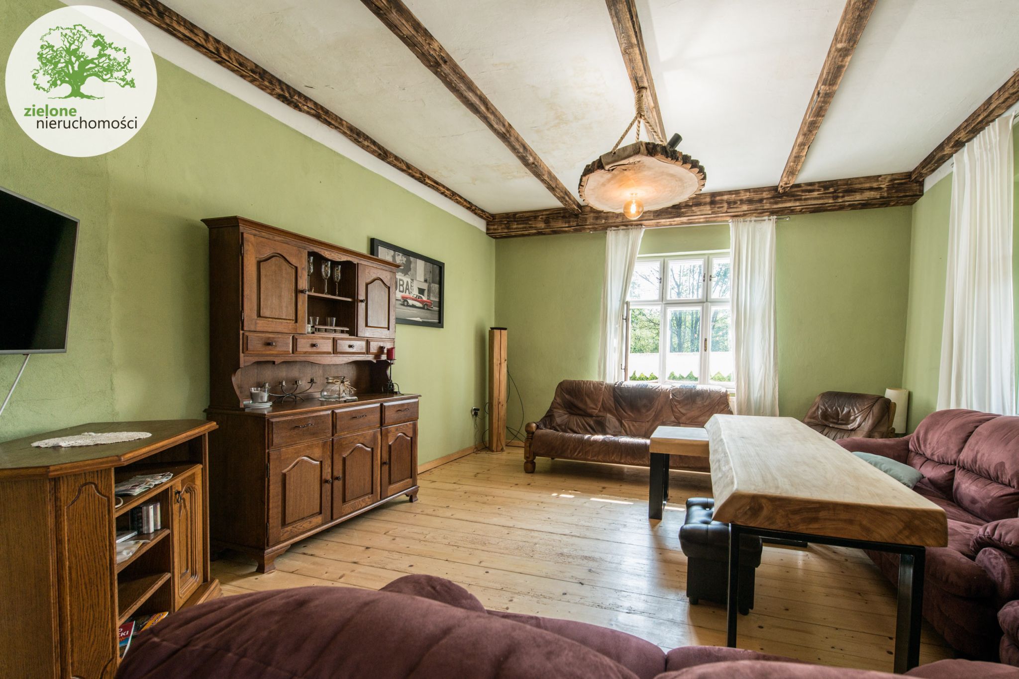 Działka wokół budynku jest ogrodzona i zagospodarowana.Na tej działce znajduje się również budynek gospodarczy , aktualnie jest tam duży pokój z kominkiem, rodzaj miejsca przeznaczonego np na spotkania przy grillu.Budynek gospodarczy może być wykorzystany jako stajnia dla koni.